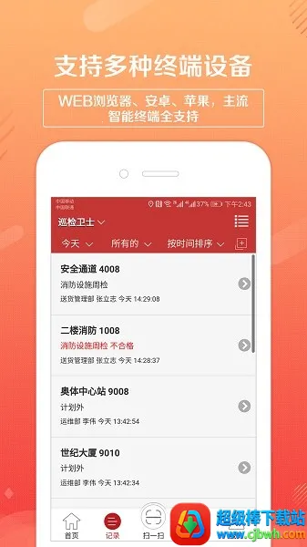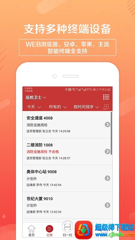 4. 全终端覆盖:支持电脑Web客户端、安卓App客户端、苹果App客户端,主流智能设备全支持,实现全过程巡检管理,包括巡检前、中、后管理,部门、人员、路线等计划任务及检查项评分查询统计功能齐全。