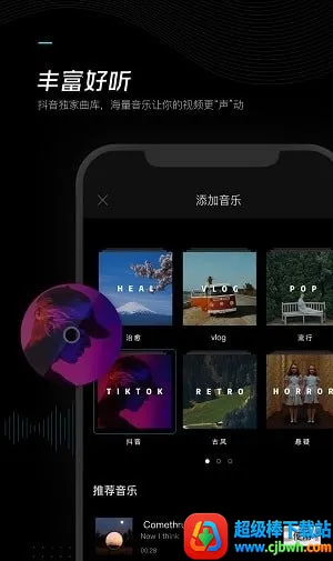 3. 丰富素材与特效:有海量音乐曲库,含独家抖音歌曲,还能变声;贴纸文本精致,有独家设计手绘贴纸和多种风格字体,增添视频乐趣;支持叠化、闪黑等多种转场效果。