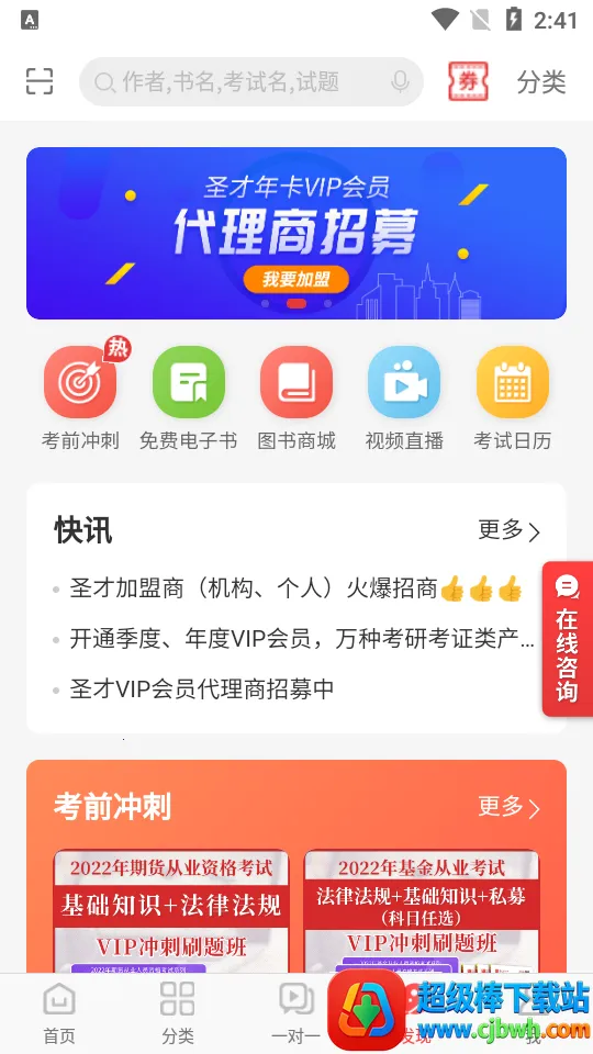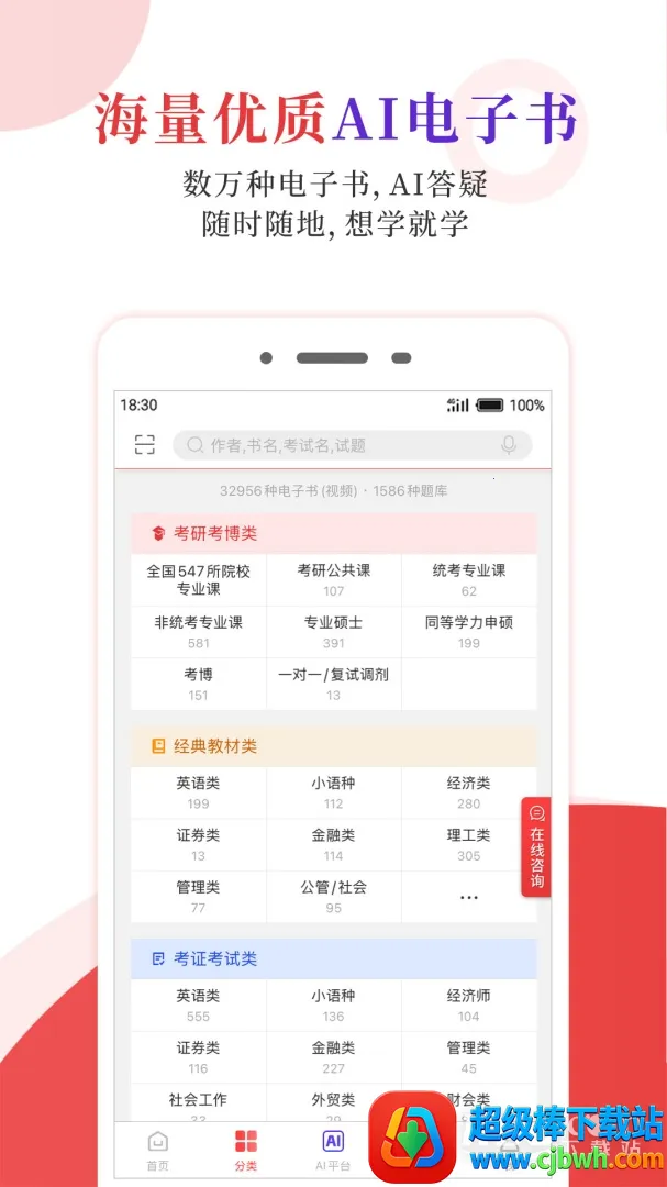 全面的考试资料:拥有6万种考试类电子书题库,涵盖各类考试学历等级职称资格等和专业课经管类外语类理工类等,电子书中植入高清视频课程,自带互动聊天直播功能。