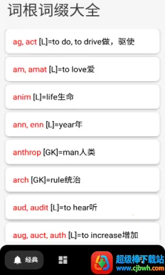 想全面掌握英语词根词缀吗?这款英语词根词缀字典大全软件绝对是你的不二之选!它完整覆盖了各种词根词缀,一个都不会遗漏。每种词根都有详细分析,帮你彻底理解其本质。独特的词根分析功能,能轻松分解每个单词,让你记单词事半功倍。其界面极简,一切围绕学习展开。软件亮点多多,能根据词根分类快速记忆单词,还有权威例句助你过目不忘。提供多种复习方式,如速查表、识别测试、听力记忆、听写练习等。通过学习词根词缀,能帮你快速提升词汇量,达到考研、托福、雅思、GRE等考试的水平。词典功能强大,有详细解释和例句,助你理解含义与用法。精心设计的检索功能,支持多种查找方式,让你快速找到想学内容。内置多样练习题,还能下载资料包Offline使用,随时随地学习无压力,赶紧下载体验吧!