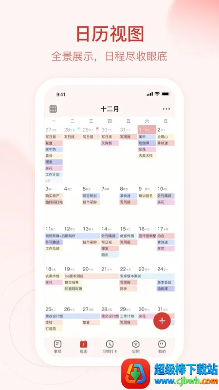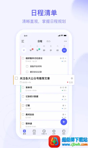1. 轻松创建任务清单并打卡,还能设置备忘录。你可以提前规划好日程安排,设定提醒时间,每天等待手机通知提醒,及时处理事项。对于不确定时间的事项,可放在待办事项中随时查看。待办事项能随时转移到日程安排的计划打卡清单。