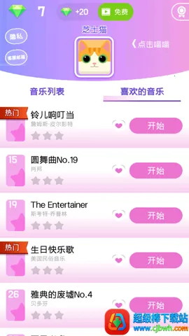 拥有丰富曲目列表,涵盖贝多芬的月光奏鸣曲等古典曲目以及流行乐坛热门歌曲,满足不同玩家音乐需求。玩家点击歌曲旁开始按钮即可进入弹奏界面。