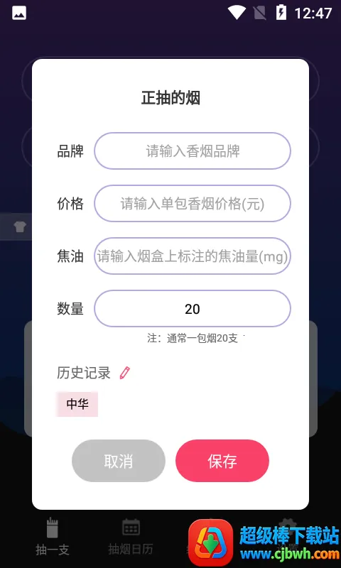 3. 费用与焦油计算:输入香烟品牌、价格与焦油量,可自动统计累计烟费与焦油摄入量,直观呈现经济与健康双重损耗,强化戒烟决心。