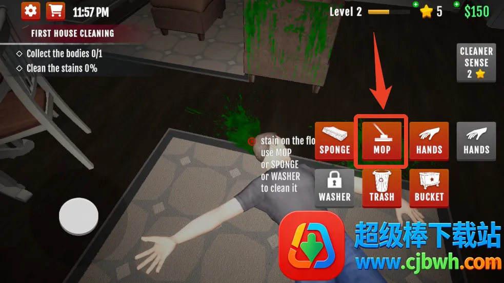 6、这时候我们点击【MOP】拿出拖把,将中间的光标对准地上的血迹出现圆圈时长按就能开始清理。