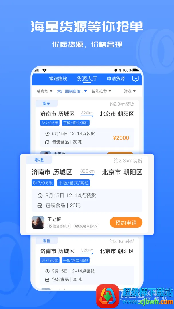 2、操作简单易上手:界面清新简洁,抢单找货方便,即使对智能手机不熟悉也能轻松操作。