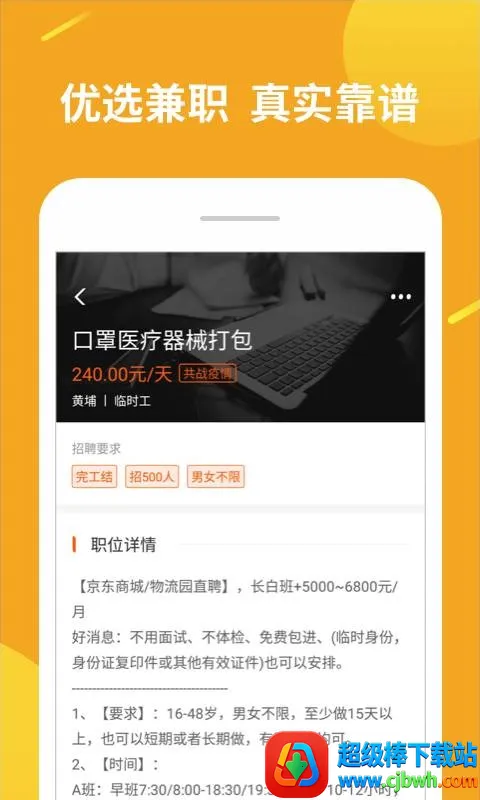 海量优质岗位:软件拥有海量岗位信息,涵盖家教、文员、翻译等数十个工种,能满足多样化需求,让你轻松找到心仪工作。