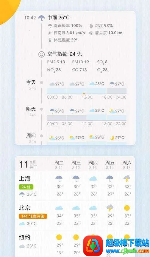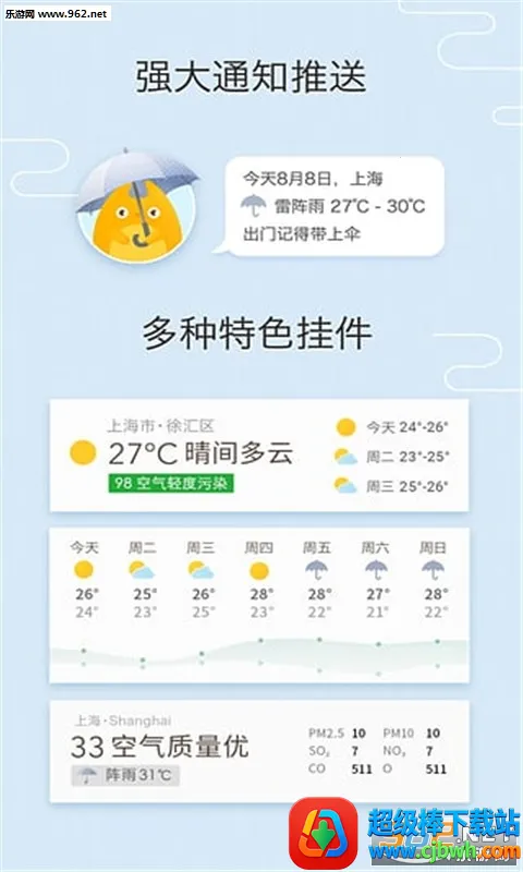 1. 实时天气信息:能随时查看当地的温度、湿度、风力、风向、空气质量等详细天气状况,还可关注多个城市的天气预报。