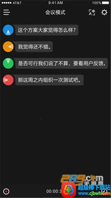 2、会议模式:设定语言后点击开始和录音按钮,系统自动为发言内容添加换行序号,实时将语音转换为文字,精准还原对话。虽部分方言识别有困难,但整体识别率高,适合多语种正式场合记录。