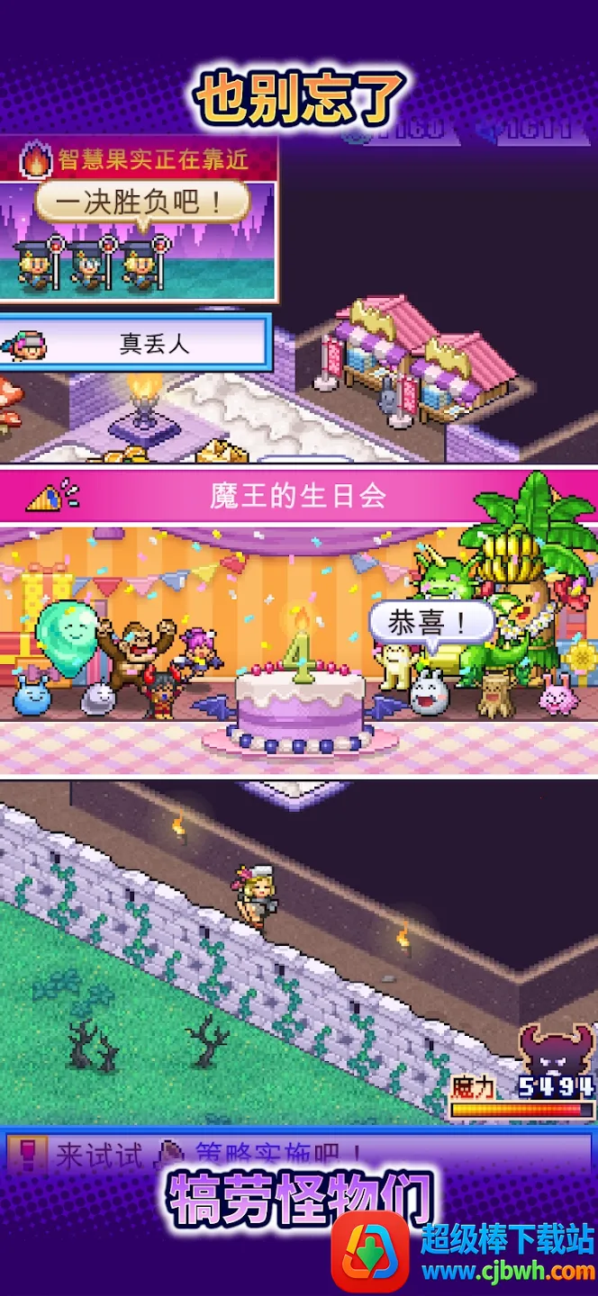 魔王城物语汉化版是开罗出品的像素风模拟经营策略游戏。玩家扮演魔王,接手破败城堡,在16年时限内,通过建设城堡、养成魔物、布局陷阱,抵御勇者进攻,书写魔王逆袭传奇,还可借助内置菜单加速发展。