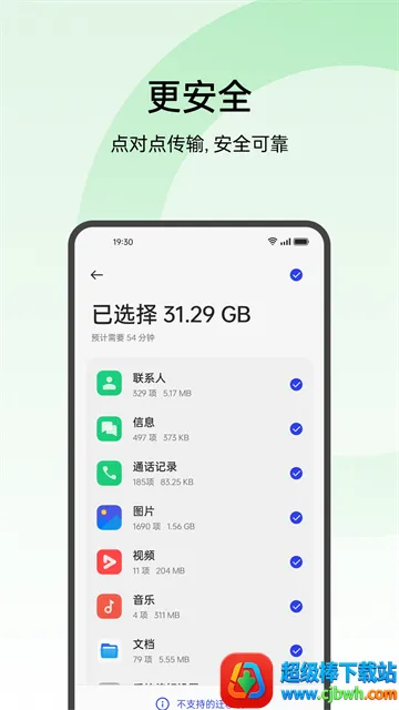3. **安全可靠**:仅在两台手机之间点对点传输本地数据,保证用户数据的绝对安全可靠。传输过程中,数据进度实时显示,一目了然。