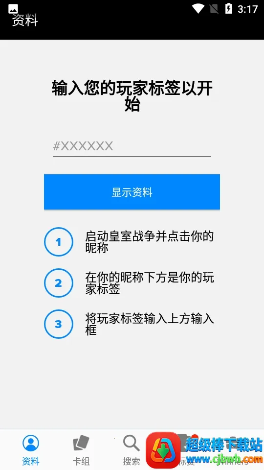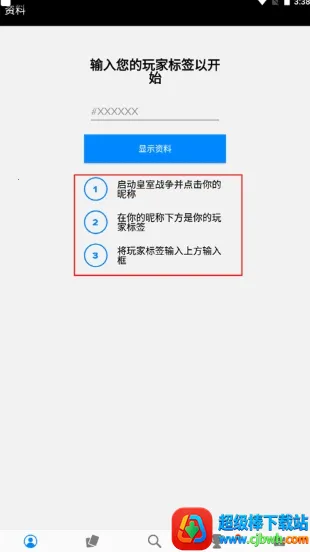 在上方显示XX的地方输入你玩家昵称下方的标签,就能显示您作为皇家战争玩家的所有资料。