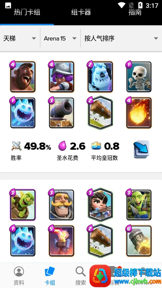 卡组主要分为热门卡组、组卡器和指南这三大块,热门卡组从天梯、竞技场等级以及人气这三个元素来筛选;组卡器就是通过你的卡牌来进行收藏;指南就是包含卡组的玩法攻略。