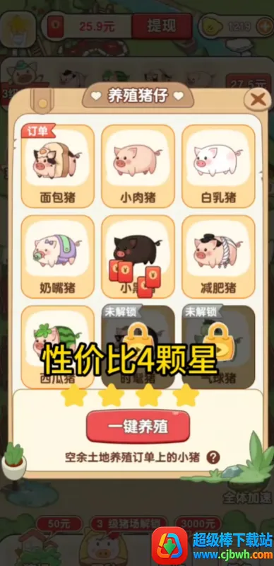 游戏提供丰富多样猪崽品种,玩家逐步解锁并培育,观察其成长变化。设有订单任务系统,完成对应订单可获红包奖励。