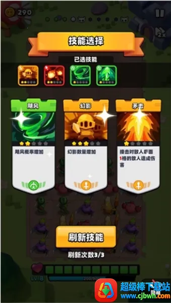 3. 解锁技能提升实力:击杀僵尸获经验奖励解锁战斗技能,每过段时间免费刷新技能提高水果英雄基础攻击力。