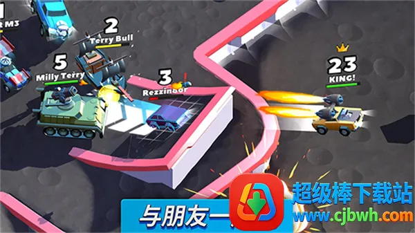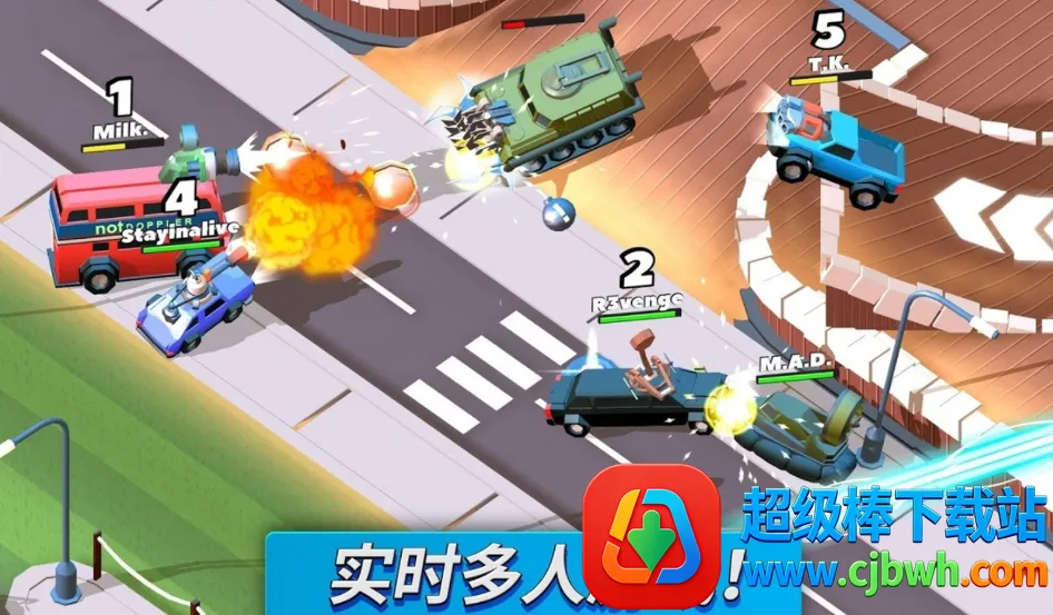 2. 丰富对战玩法:驾驶车辆与其他玩家对抗,场景中设有各类未知道具,拾取后能增强实力,同时还有联机游戏模式,可与好友共同畅享游戏乐趣。