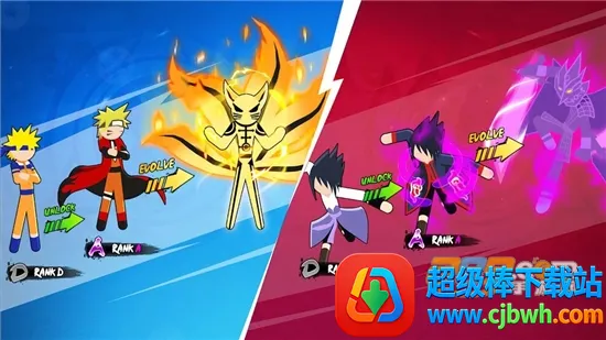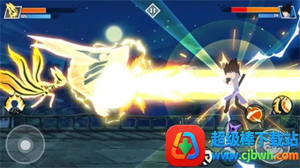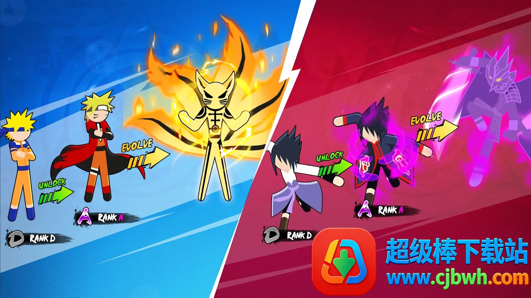 玩家可操控火影忍者模式的火柴人进行格斗闯关,角色拥有独特大招和技能,如鸣人、佐助等专属技能,全解锁版本可直接选择。