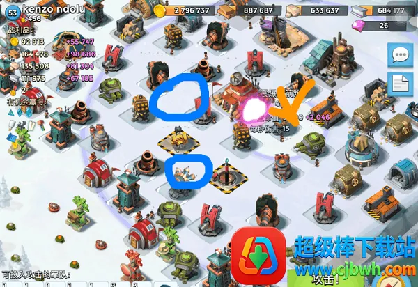 【高阶】这里就讲到一个卡位问题 当你还有其它部队 却不想让他们攻击控制建筑,怎么办呢?这里举纯妹为例 你可以把妹妹引导到菊花的后面 然后引导大本 这时候按下技能 只要伊娃离的够近 就能成功控到菊花 从而在吸引火力的同时解决棘手目标 如果在不同方位可能需要用上震爆弹 这个技术是看经历和觉悟的 我也不太会