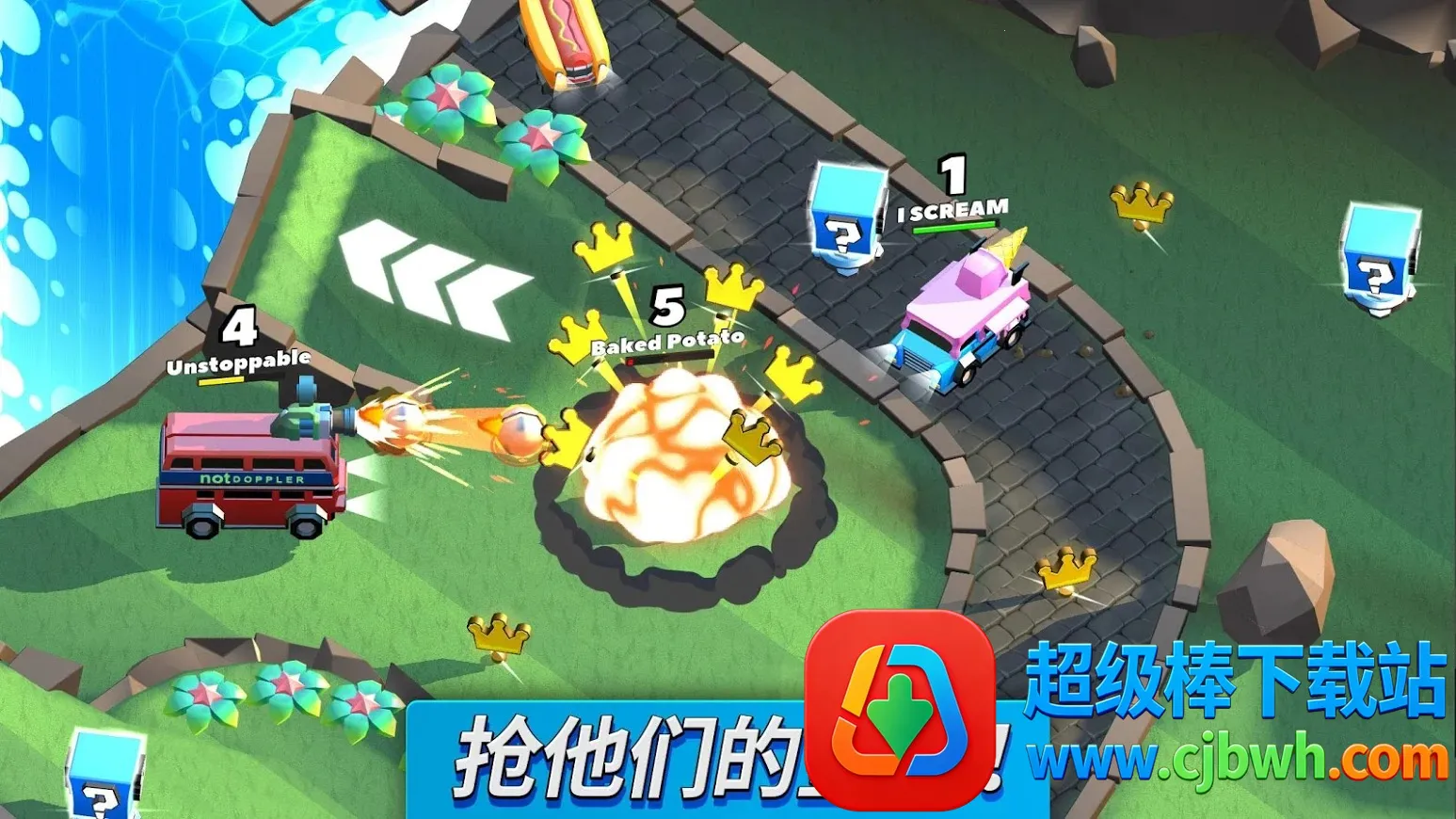 嘿,喜欢赛车撞击游戏的朋友们看过来!疯狂撞车王这款游戏超有趣。在游戏里,你能参加各种比赛,目标是在被摧毁前收集超多皇冠,击败敌人还能得强化道具,助你在排行榜名列前茅。这里有多达八张风格各异的地图任你选,每张难度不同。还有70多辆可解锁汽车,分普通、稀有、史诗、传说级,能换不同皮肤自由搭配。海量道具像喷火器、大炮、投石机等,操作简单,撞敌方赛车、拾取掉落物品就行。