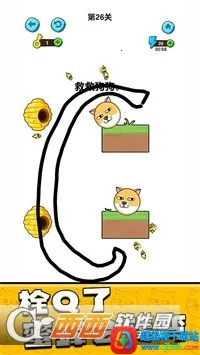 1、玩家手绘线条搭建防护屏障,解救滚落危险区域的滚动狗头,躲避悬崖、岩浆等多重险境,若狗头触险则闯关失败,同时要规避蜜蜂蛰咬。