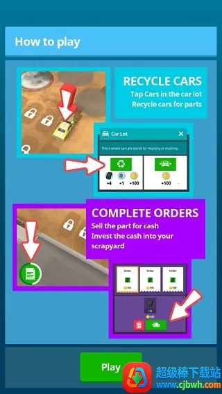 将汽车运送到车房,然后起重机将其移至汽车断路器,在那里拆卸工场的工人将汽车上的零件卸下;然后将它们移至破碎机,并将备件移至仓库,玩家随后解锁了诸如轮式工作站之类的制作站。他们可以购买制作不同物品的蓝图,所有人都成为一个无用的废品大亨,成为百万富翁的资本家!