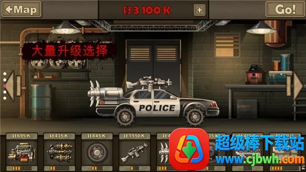 **汽车改装系统**:可使用金币购买各种零件强化车身。比如升级引擎能加速更快且耗油更少;变速箱可增加驾驶最大速度;轮胎抓地力更佳、提高上坡性能;还有枪支能自动发射子弹射击僵尸,推进器可喷火加速,重新配重利于通过路障及碾压僵尸,装甲让战车更耐撞,油箱能增加油量。