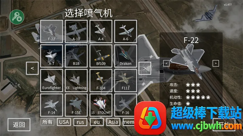1. 丰富多样的飞机选择:提供50多架不同型号喷气式飞机,如F-22、F-14、Su-57等,满足玩家驾驶不同战机的愿望。