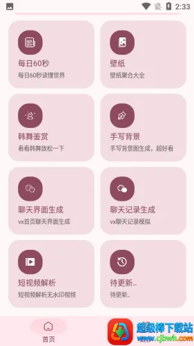 4、多样功能选择:可一站式发现各种有趣功能,如每日新闻、壁纸、韩舞、手写背景、聊天记录生成等。打开软件一键选择所需功能,像手写背景图,选效果图、输名字点击生成,支持保存,还能挑选感兴趣软件下载。工具界面还有藏头诗生成等超多功能。