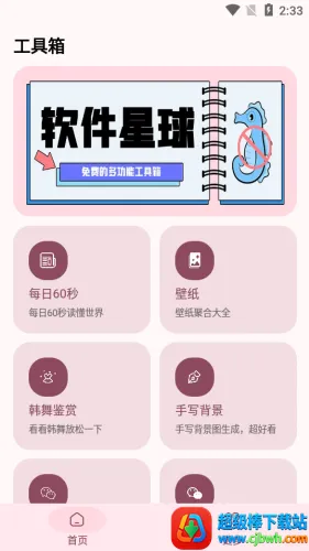 软件星球APP是多功能工具箱软件,有每日新闻、壁纸、韩舞等功能。界面清爽,能一键打开功能。还有专属个性舞台、生活便捷管家、海量资源宝库等特色,使用方便,可快速生成背景图、下载软件等。