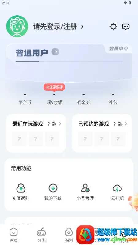 超V手游平台是精品手游玩家的福利平台。它整合了多款热门手游资源,能满足你畅玩各类热门游戏的需求。平台主打实用省钱的游玩体验,自带专属充值优惠体系,充值只需支付折扣价格,还有海量代金券可折上折,进一步降低消费成本。这里有海量游戏礼包免费领取,让你游戏开局更轻松。更有官方正版BT游戏,上线送满V、送元宝,能让你感受GM一般的游戏体验。搜索游戏很方便,点击上方搜索功能,输入游戏名称即可。注册登录也简单,在精品网下载后,进入软件点击右下角“我的”,再点“立即登录”,输入账号密码就行。下载游戏时,点击选择游戏,再点“立即下载”就能完成。总之,超V手游平台为你提供了便捷、实惠又好玩的游戏下载及游玩体验。