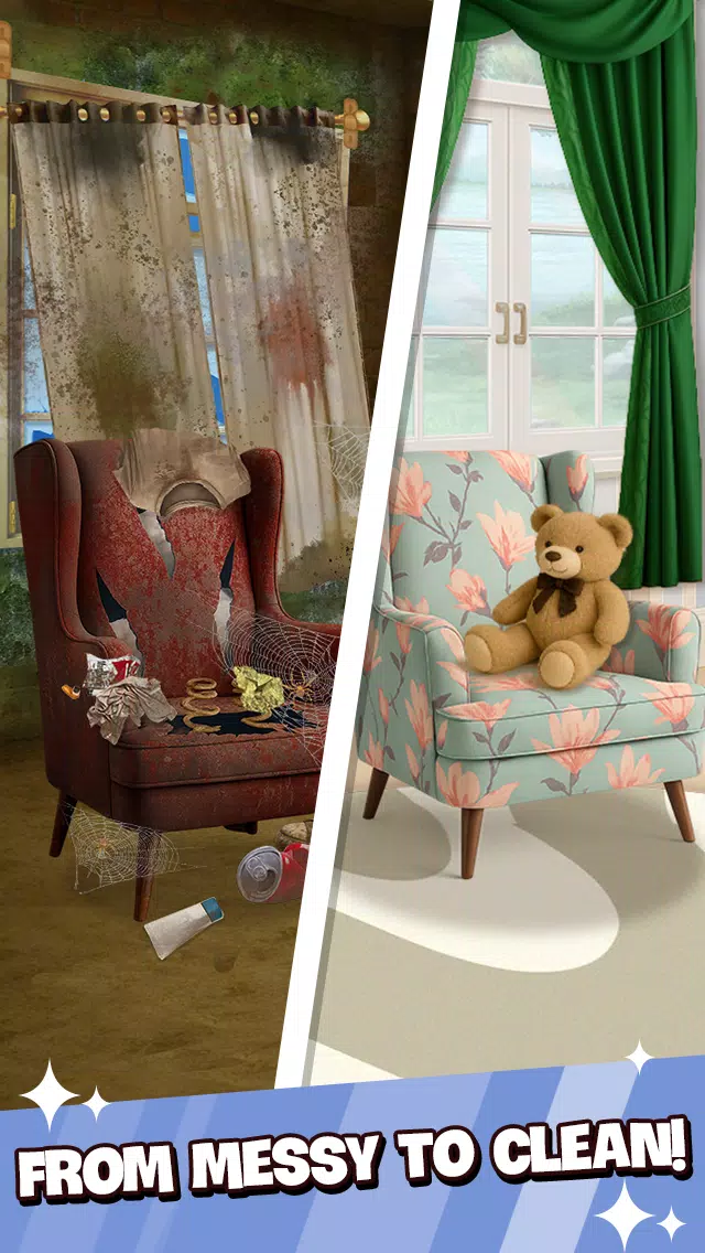可撕掉破旧墙纸,在打扫房间时感受赏心悦目的视觉与音效,操作流畅直观,精心修复家具、屋顶墙壁和壁炉等室内元素。
