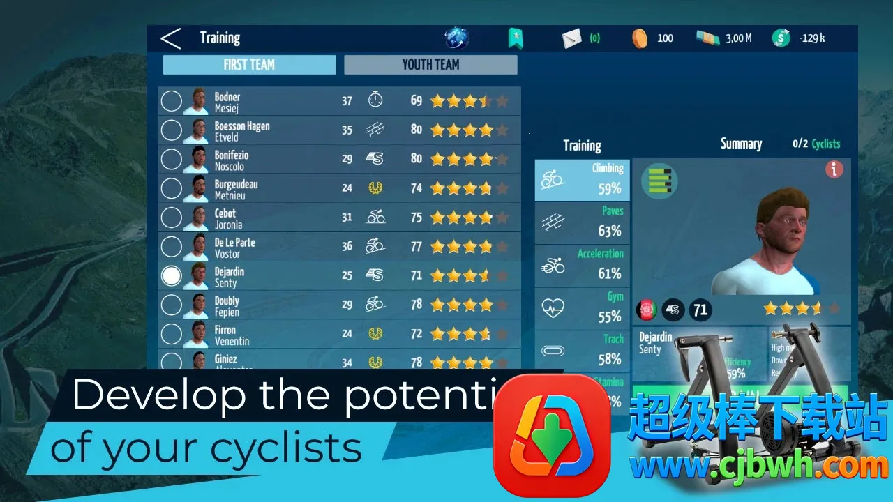 细致的人员与资源管理:能训练赛车手,送他们去赛前训练营提升属性;与运动器材制造商谈判获取最好自行车并研究改进组件;管理员工,从机械师到物理治疗师等各有专人;寻找最佳赞助商并谈判,通过商品管理创收;雇用运输供应商提升骑手表现和休息;物色年轻人才并培养提拔。