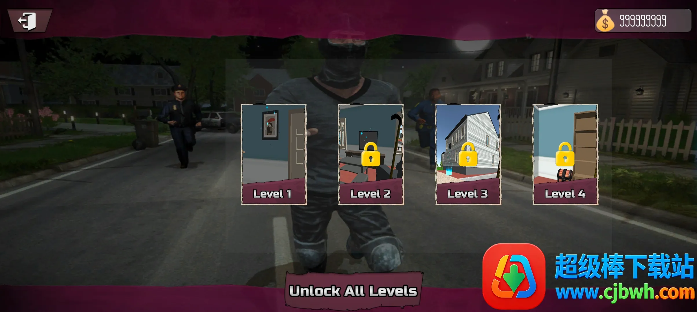 游戏玩法丰富,用虚拟键控制角色移动、跳跃、奔跑,还有切换工具等操作。进入游戏先选关卡,熟悉键位后就能开始盗窃啦。这里有多种房屋可潜入,像邻居家、豪宅等,里面有钻石、黄金、珠宝等贵重物品等你偷。而且你还会获得线索和提示,甚至有黑客工具套件帮你开门。