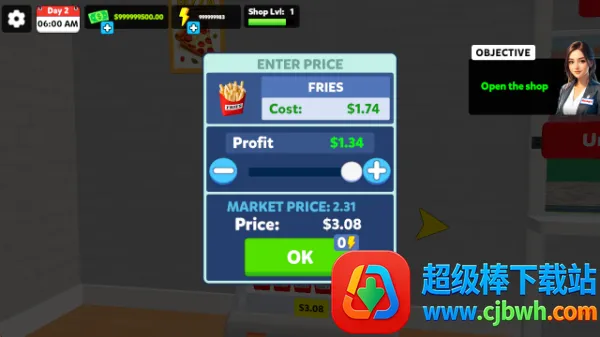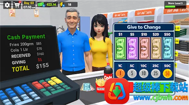 游戏玩法丰富多样。开始游戏后先在商店进货,商品送到打开盒子放置到货柜,设置好价格。店内披萨机器可制作披萨同样摆上货柜。在收银台待命,根据客人支付方式计算金额找零。随着服务人数增多提升等级解锁更多商品。