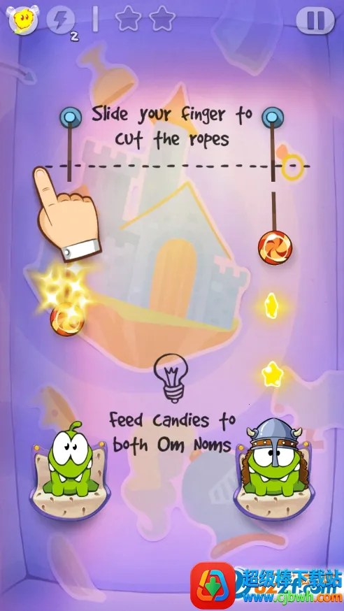 3. 益智挑战:简单操作易上手,却极具思维和操作技巧挑战,比如要同时切断两条绳子等,通关关键是让OmNom吃到糖果并获三星评价。
