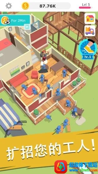 3. 多样的游戏内容:放置建造模式轻松解压,离线挂机工人持续建设;多种图纸方案可改造设计增加收益;随机惊喜彩蛋有机会掉落特殊物品提高效率;能点击加速道具完成建筑获取奖励;需查看工程队伍人数上限选择性雇佣。