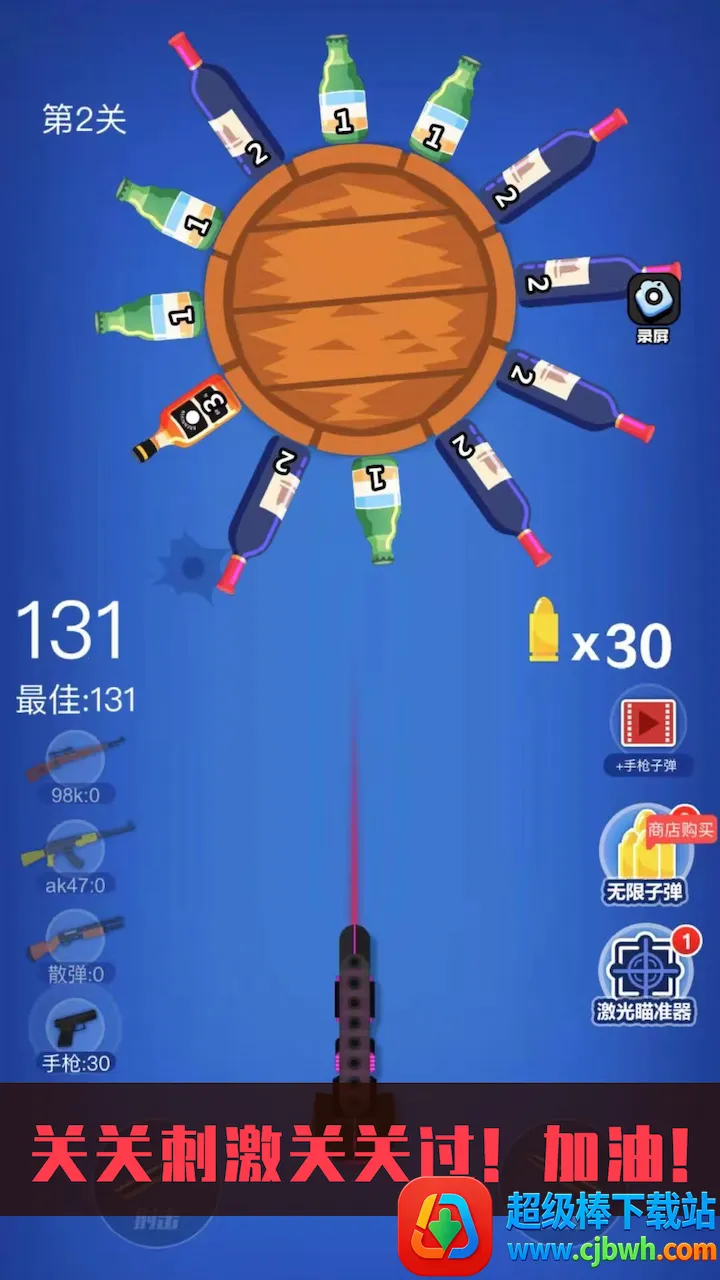 玩家可通过射击瓶子获取分数,成功过关能获奖励,用于升级武器、解锁皮肤,还能通过转转盘赢取大奖。