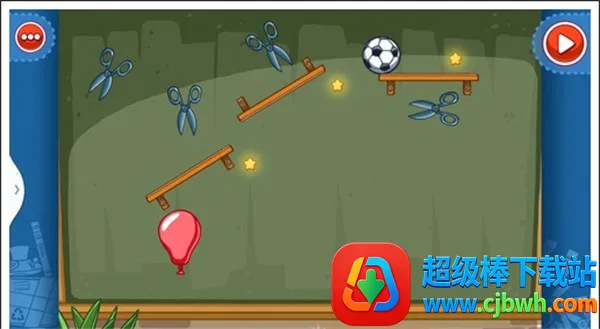 我们只需要将三个木板凳各自斜放在星星上头就可以让气球自由飞上去,获得星星。