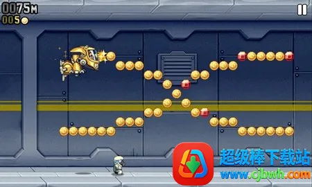 操控角色躲避障碍:通过点击屏幕控制角色上下飞行,躲避如激光、电网、导向飞弹、固定电闸、可旋转电闸、火箭炮光束等各式各样的障碍物。