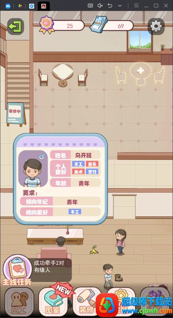 这是一款超有意思的模拟婚介所管理游戏。**玩法丰富**,能招募训练顾问、扩建装修婚介所、安排活动派对等。**特色众多**,有社交互动、持续更新、丰富成就系统。还能自由装饰、竞技挑战、培养员工。**亮点突出**,配对方式多元、情感剧情动人、视听精美。在这里,玩家能真切体验经营婚介所,为单身男女牵线搭桥,助力他们收获幸福,感受创造美好姻缘的乐趣,非常值得一玩。