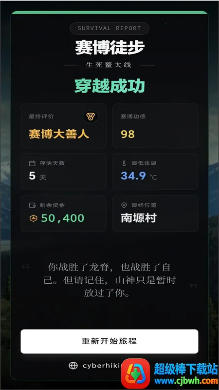 赛博徒步之生死鳌太线是一款独特的生存冒险手游。它高度还原鳌太线核心路段,地形植被逼真。多日程徒步机制考验规划能力,动态气象系统增添挑战。真实生理反馈机制让玩家谨慎管理指标。游戏并非追求爽感,而是耐心与理性的试炼,提醒玩家敬畏自然。玩家需依据天气选路线,备齐装备,合理应对突发状况。对于喜欢硬核生存或户外徒步的玩家,它极具沉浸感与警示意义,能带来别样的冒险体验。