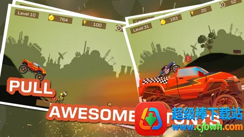 怪物卡车2是一款极具挑战性的赛车游戏。驾驶美式巨型卡车,在限定时间内突破障碍抵达终点。游戏画面和效果出色,有50条精心设计的赛道,还有多种车型可供选择。逼真的物理特效,让玩家感受真实驾驶体验。游戏有单人、多人模式,多种挑战模式等你选择。在驾驶过程中,要留意各种障碍物,如巨石、滚木、僵尸等。下坡需把握平衡防止翻车,可按住前车胎上提。收集金币购买新车和vip卡延长时间,撞击油桶和僵尸还能获高分,非常值得一试。