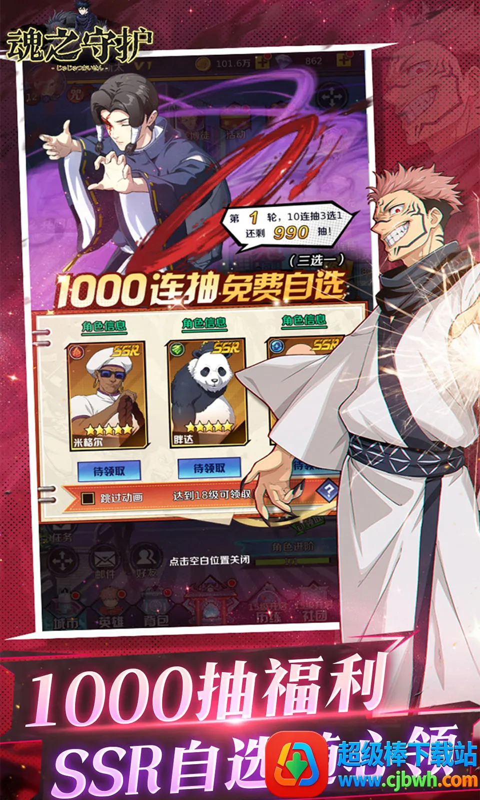 魂之守护安卓版是以超人气动漫咒术回战为蓝本的竖版卡牌策略手游。复现原作世界观,可收集人气角色组建小队。有GM版、折扣版、官服等版本,各有特色福利,如送充值券、UR卡、满V等,玩法丰富。
