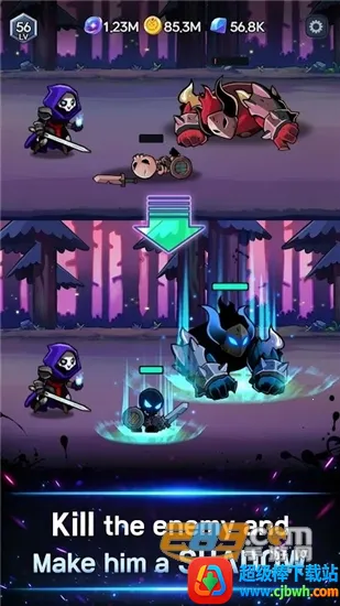 2. 影子士兵召唤:击败敌人可获取资源制造影子士兵,组建庞大军团。这些昔日敌人成为忠诚战士,利用其力量与技能征服敌对势力。