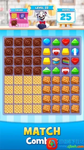 3. 多样玩法:除经典三消,四个相同颜色曲奇相遇可产生特殊曲奇,五个可产生彩虹蛋糕等,还有多种道具辅助。