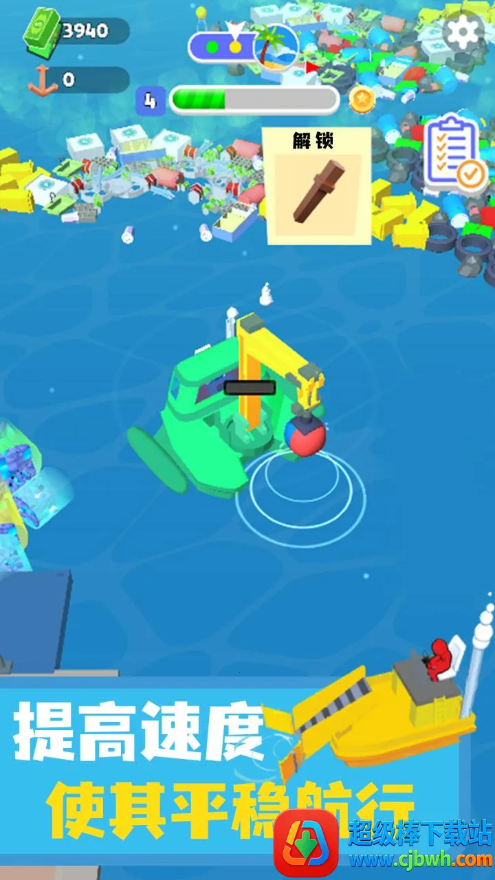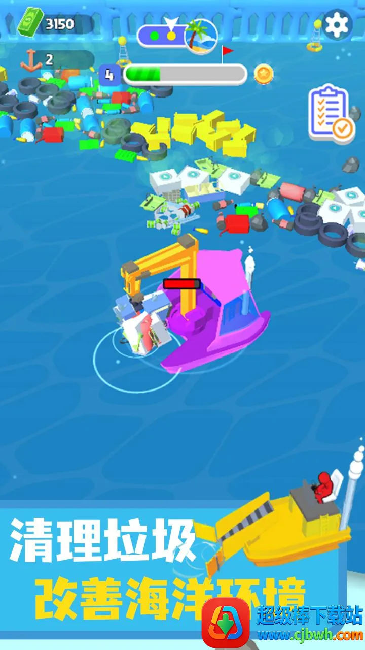游戏中有多种任务,如收集海面垃圾并处理售卖,购买设备清理海洋垃圾,还包括在海岸线上清理垃圾、潜水捡拾海底垃圾、救助受伤海洋动物等。