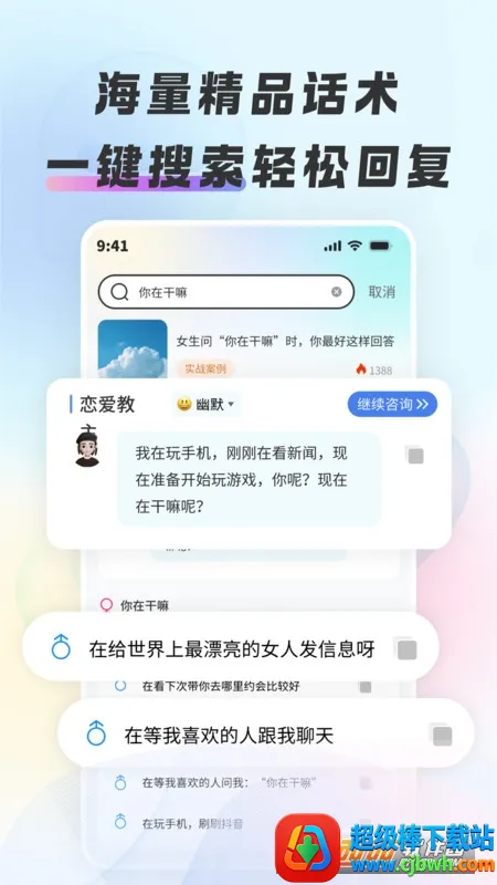 拥有海量话术:根据恋爱场景精心挑选了10W实用话术,在App一键搜索就能轻松找到合适话题,助力追爱之路毫无压力。