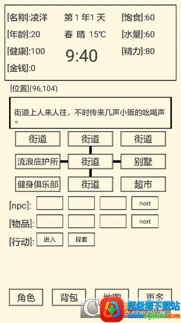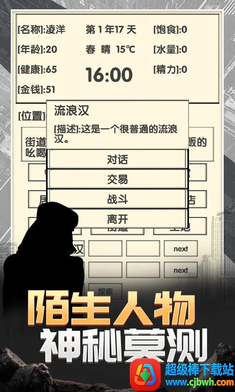 《流浪人生2命运》是一款超有趣的文字冒险游戏。它构建了一个开放世界,让失忆主角面临各种生存抉择。你可以选择隐姓埋名体验街头流浪,也能通过追踪线索揭开身份谜团。游戏有200×200的大地图,走格子玩法,能与多种场景和NPC自由交互。剧情充满悬念,围绕探寻失忆真相展开。还有季节天气系统,一年四季温度随季变,天气随机,不同气候影响角色状态。而且有不死特性,健康值为0也不会死亡,不用担心删档。在这里,你能体验真实的天气和四季变化,注意保持健康值。会遇到各种不同的事情,带来惊喜。还能选择两种玩法路线,要么找回记忆与身份,要么开启新的流浪人生。反复尝试熟悉生存系统,感受命运无常的叙事深度,绝对值得一玩。