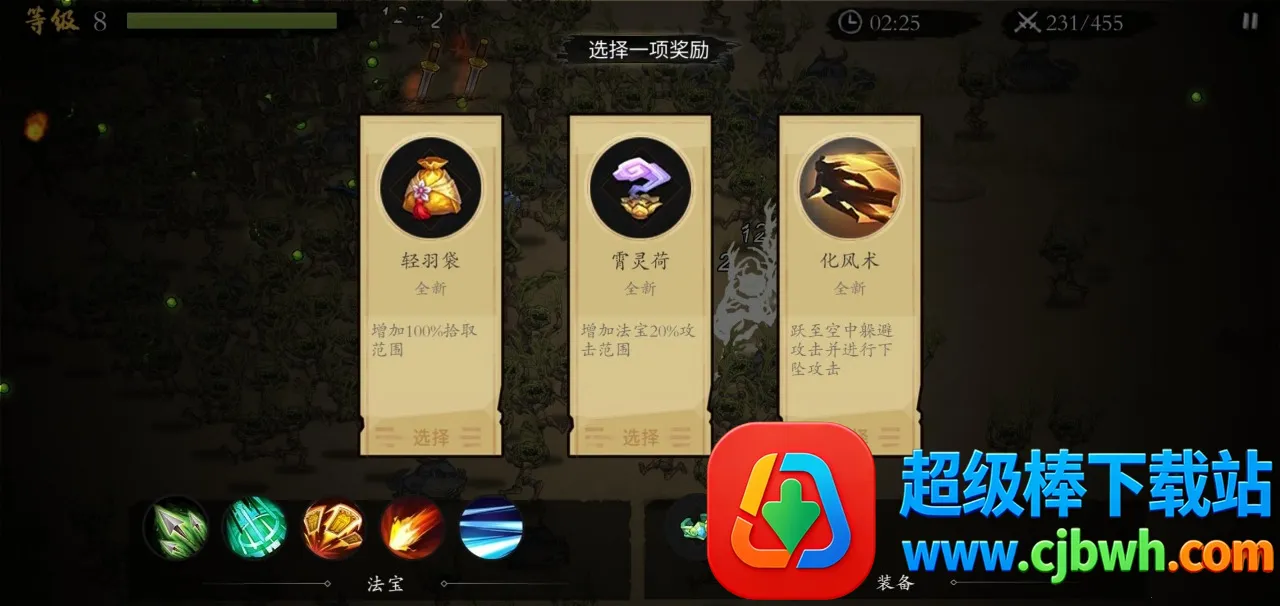 丰富技能搭配:每次升级都有可选技能,合理搭配不同技能才能更好通关游戏。玩家在战斗中可通过左手摇杆控制移动,右手释放主动技能,面对如海潮般涌来的妖兽,运用各类法宝搭配技能取得胜利。