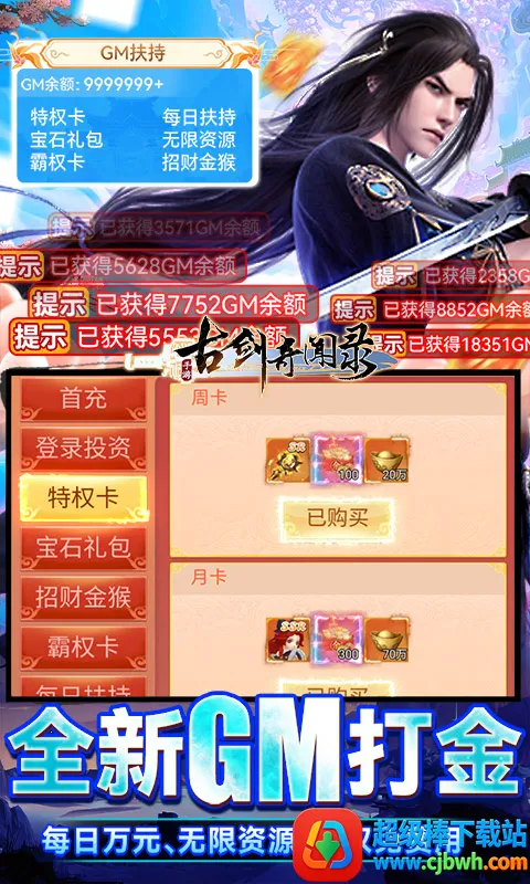 嘿,喜欢仙侠游戏的朋友们看过来!古剑奇闻录能给你带来超爽体验。它是一款挂机修仙手游,有热血无双的割草快感。精致建模展现东方仙侠盛景,技能炫酷,打击感超棒。在这仙侠世界里,能一剑荡平野外妖道,反击敌对玩家挑衅,捍卫宗门荣耀,还有高度自由的PVP玩法任你驰骋。而且福利超多,上线就享封神快感,修仙之路轻松起步。它的充值很划算,所有充值档位0.1折,无次数限制。创角免费解锁满级VIP,还送极品武器。每天签到领仙玉卡升级GM等级,能在GM商城买道具。解锁GM扶持礼包后,可购买无限货币。上线送满SVIP、全套红装、大量仙玉、元宝、银币、极品称号和仙翼。总之,能让你尽情享受仙侠世界的精彩,满足你对无限资源的需求,快来下载体验吧!