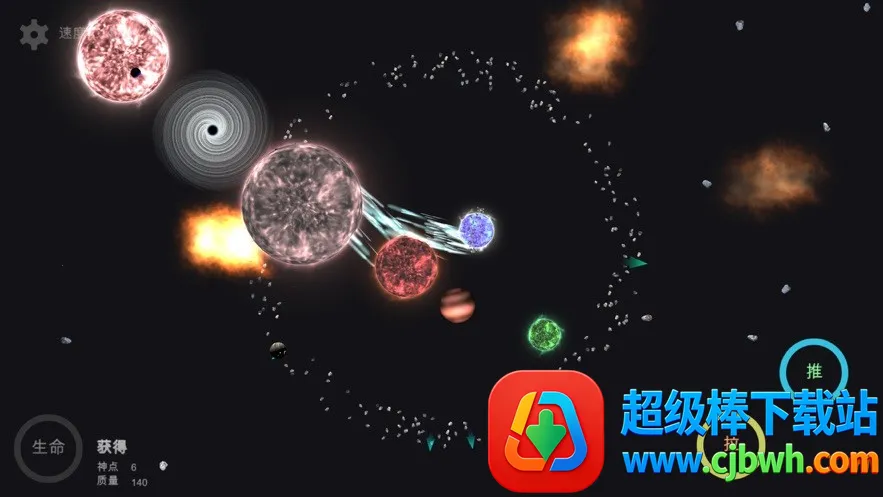 1、自由创造:能在浩瀚宇宙中自由添加星球、创造星系,还可操控星球自由移动,点击任意方向喷火增加移动速度并更改方向。